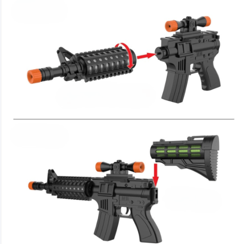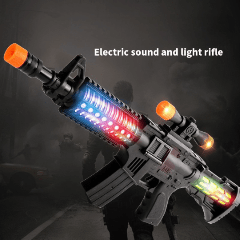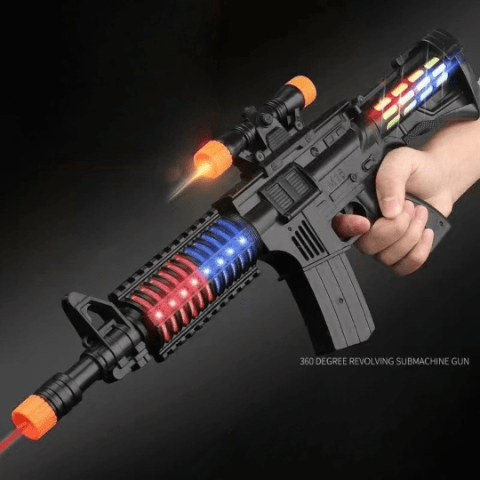 Pușca de jucărie cu design realist și lumini LED multicolore oferă copiilor o experiență de joacă plină de acțiune.