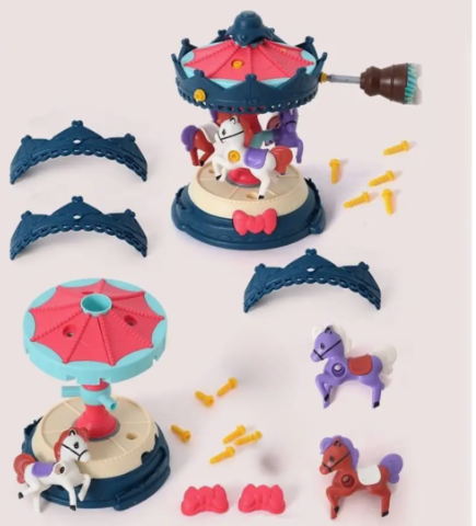 Caruselul vine cu mai multe piese colorate care se pot asambla cu ușurință, folosind o mini bormașină inclusă.