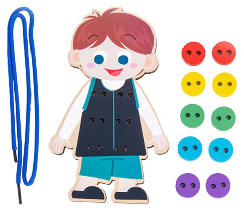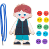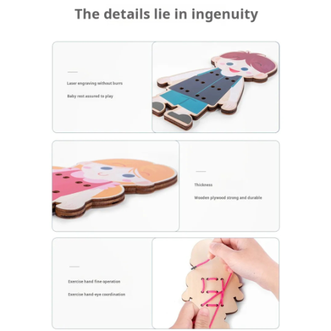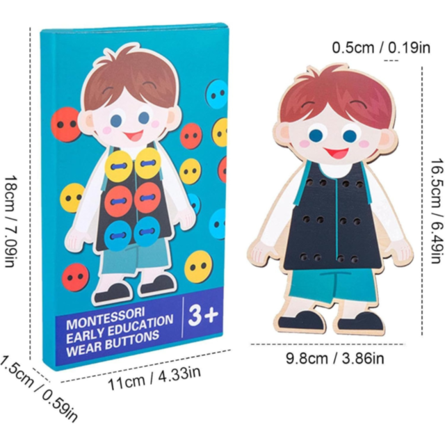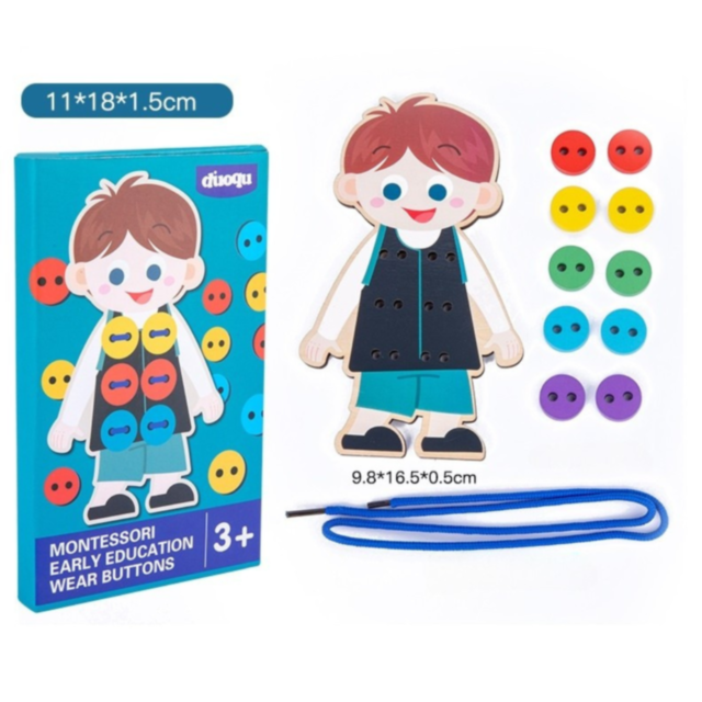 Fiecare set include o figură din lemn cu găuri pentru nasturi și un șiret, oferind oportunitatea de a exersa coordonarea ochi-mână și motricitatea fină.