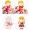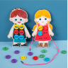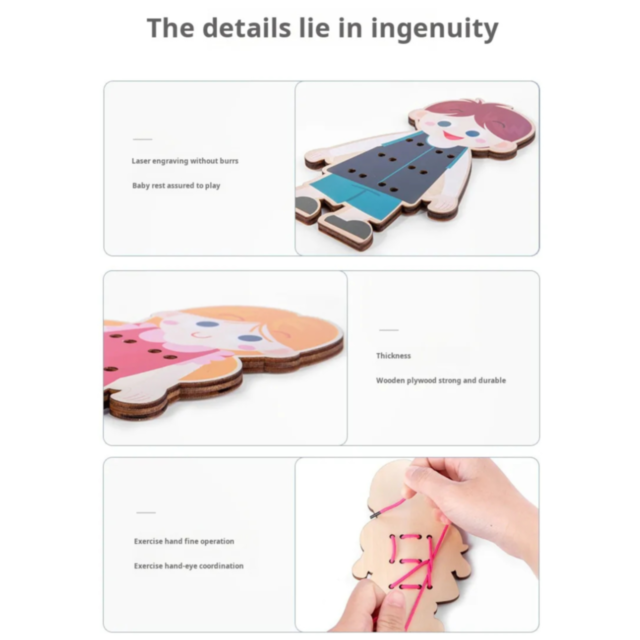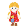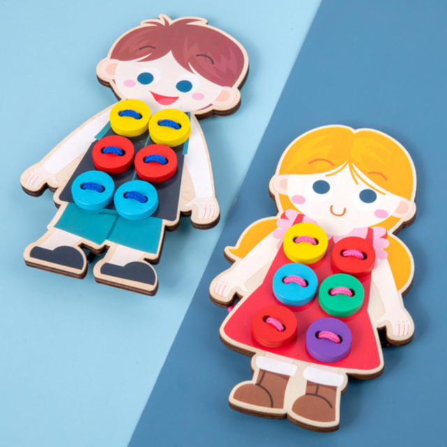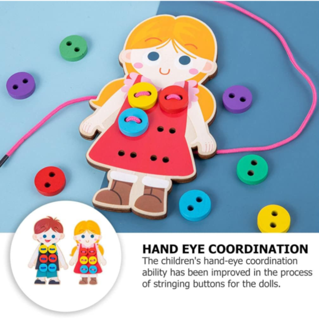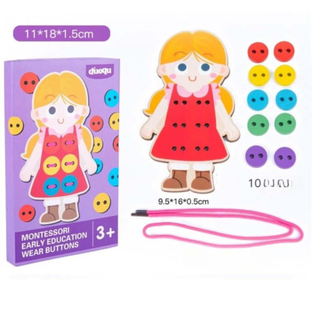 Această jucărie Montessori din lemn stimulează îndemânarea și creativitatea celor mici, oferindu-le o experiență interactivă prin prinderea nasturilor colorați pe rochița fetiței.