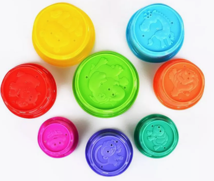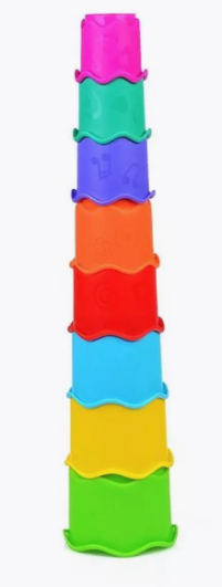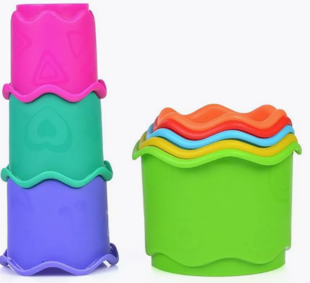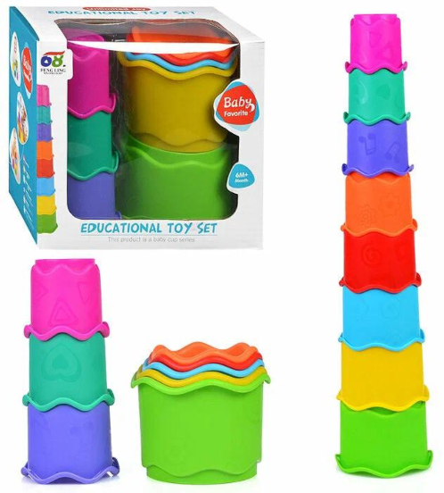 Paharele sunt stivuite pentru a crea un turn înalt, oferindu-le copiilor satisfacția construcției și a jocului creativ.