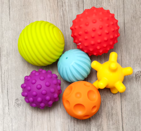 Mingile senzoriale, fiecare cu texturi diferite și culori vibrante, sunt ideale pentru explorarea tactilă și joaca activă.