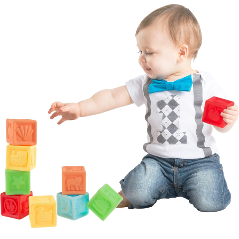 Cuburile moi și colorate, decorate cu imagini de animale și litere, îi ajută pe cei mici să își dezvolte coordonarea și creativitatea, fiind perfecte pentru a fi stivuite și manipulate.