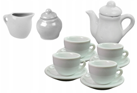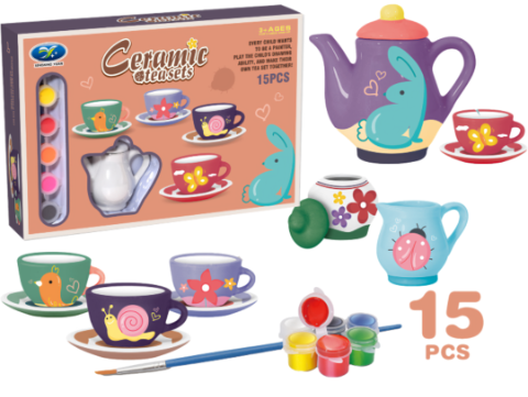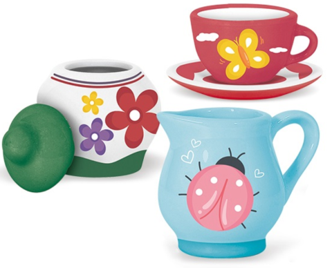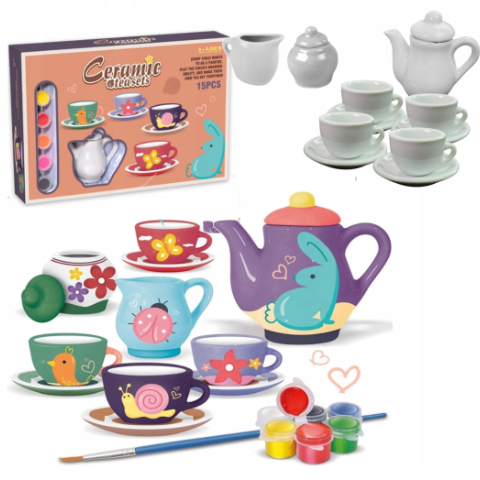 Ceainicul, ceștile și accesoriile vin într-o formă albă, pregătită pentru a fi pictată cu imaginația fiecărui copil.