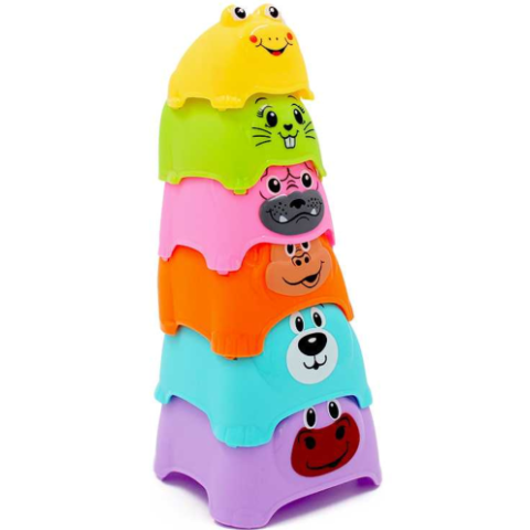 Această piramidă veselă și colorată aduce laolaltă animale simpatice, fiecare într-o culoare vibrantă, care captează atenția micuțului tău.