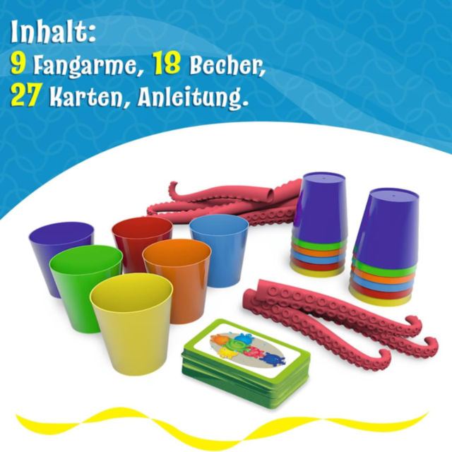 Setul include 12 pahare viu colorate, 6 tentacule flexibile și 24 de cărți cu modele distractive, oferind ore întregi de distracție educativă.