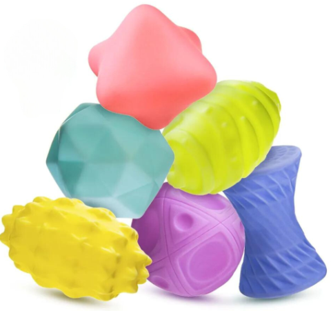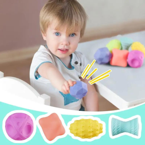 Setul include 6 mingi de forme și culori variate, potrivite pentru bebeluși începând cu vârsta de 18 luni. Jucăriile sunt ușor de curățat și sunt gândite să încurajeze curiozitatea și joaca activă, contribuind la dezvoltarea simțului tactil și a coordonării mână-ochi.