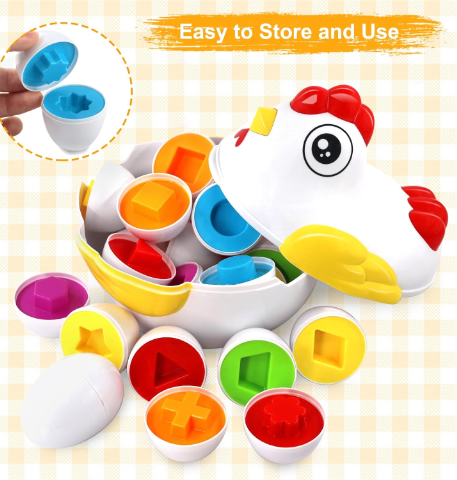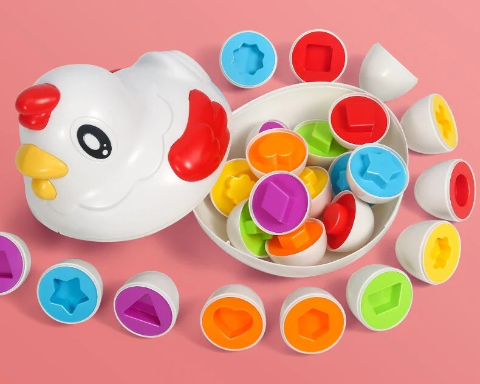 Acest set adorabil de ouă educative în formă de pui este perfect pentru cei mici care învață să recunoască formele și culorile.