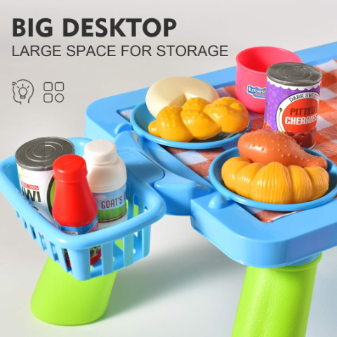 Masa robustă și colorată, cu spații speciale pentru fiecare ustensilă, creează o experiență captivantă.
