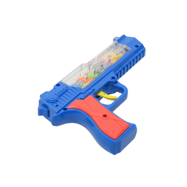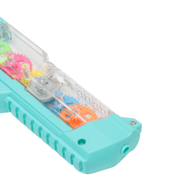 Designul transparent al pistolului permite vizualizarea mecanismului intern, iar culorile strălucitoare ale roților mecanice fascinează copiii, încurajându-i să descopere cum funcționează.