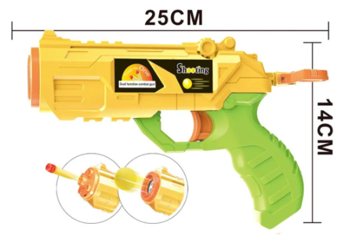 Acest pistol de jucărie cu funcție dublă aduce entuziasmul jocurilor de acțiune direct în mâinile celor mici.