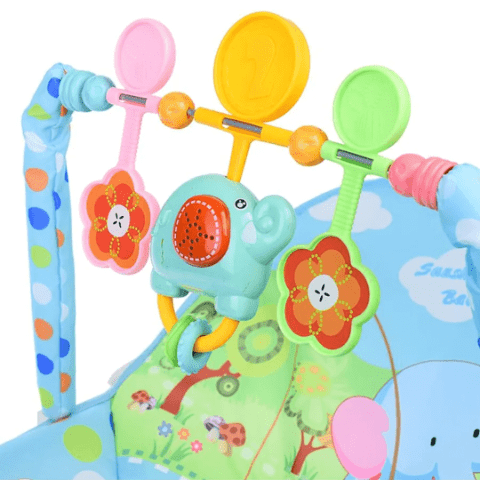 Bara cu jucării viu colorate și sunete muzicale stimulează dezvoltarea senzorială și coordonarea ochi-mână.