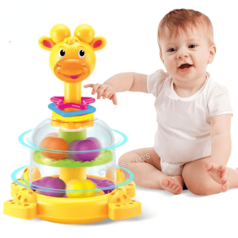 Printr-o simplă apăsare pe capul girafei, bilele colorate din interiorul cupolei se rotesc rapid, captând imediat atenția copilului.