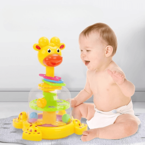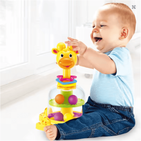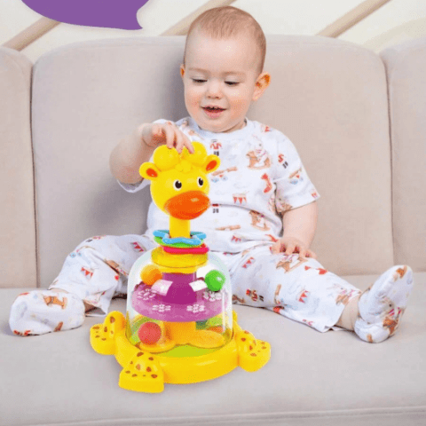 Sub zâmbetul jucăuș al girafei galbene, bebelușii descoperă o lume plină de mișcare, culoare și distracție.