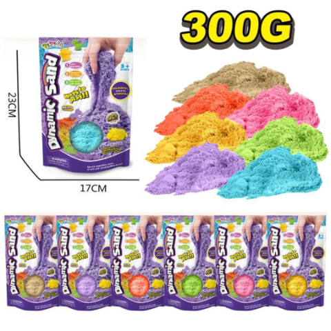 Pachetul conține 300 de grame de nisip colorat, ușor de modelat și perfect pentru activități educative și distractive.