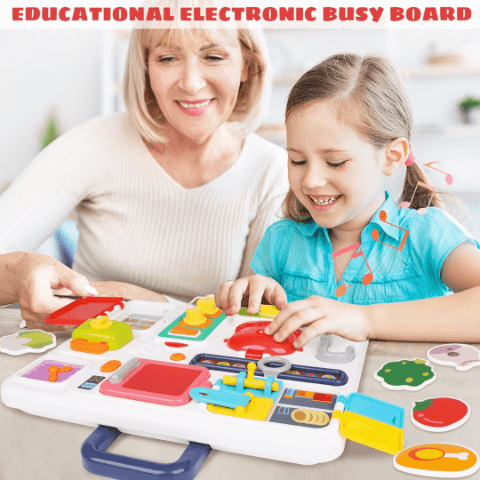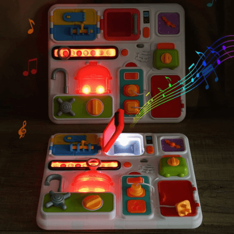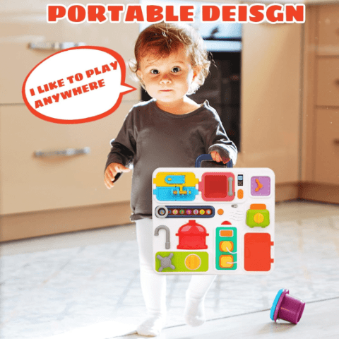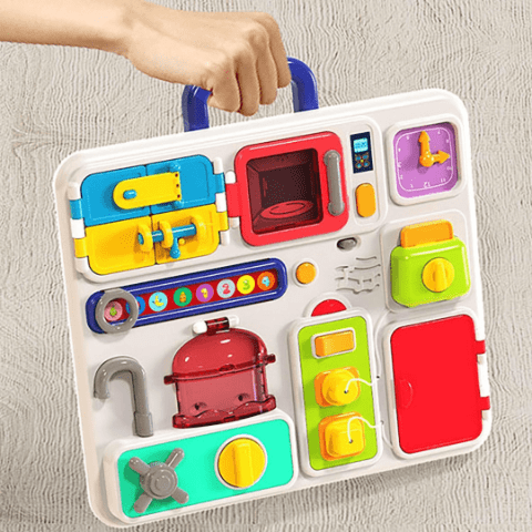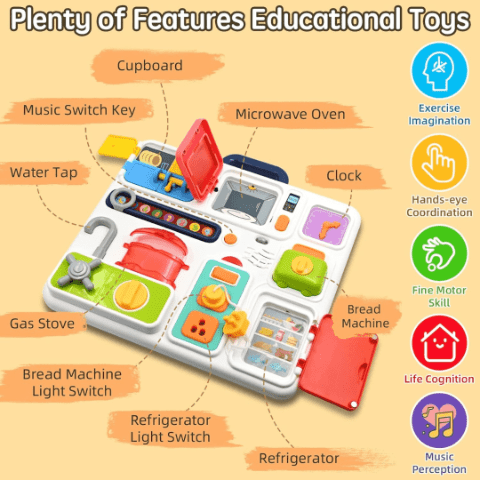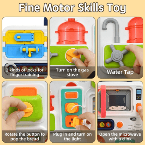 Copiii pot exersa coordonarea și logica prin rotirea butoanelor, deschiderea ușilor și apăsarea clapetelor care imită electrocasnice reale.