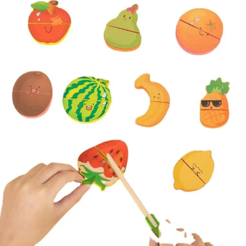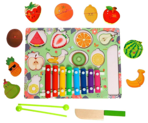 Acest set educațional 2 în 1 combină distracția muzicală cu jocul de tăiere a fructelor magnetice.