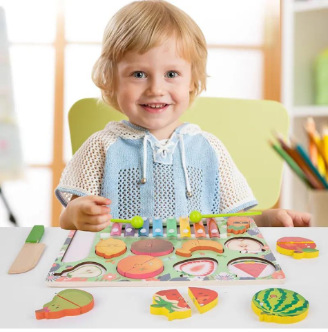 Xilofonul colorat ajută copilul să descopere sunetele și să-și dezvolte simțul ritmului, în timp ce fructele magnetice sunt perfecte pentru a învăța despre forme și culori.