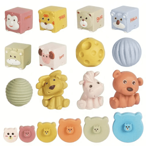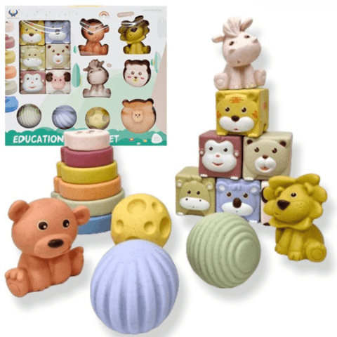 Setul include și cuburi numerotate și decorate cu chipuri de animale, perfecte pentru joacă liberă sau jocuri de stivuire.