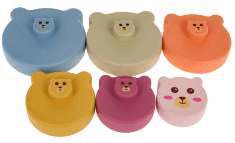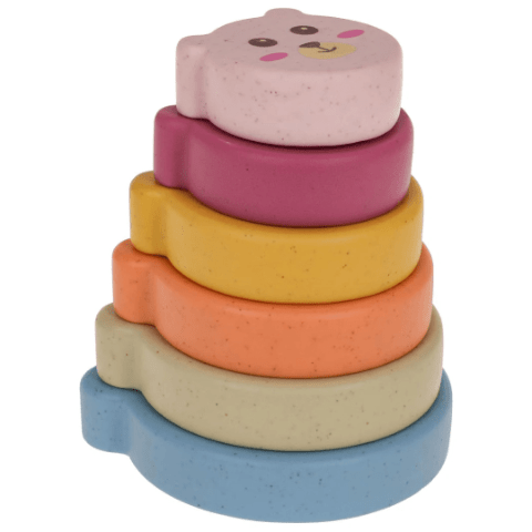 Turnul cu inele colorate în formă de ursuleț ajută la învățarea dimensiunilor și dezvoltarea coordonării mâna-ochi.
