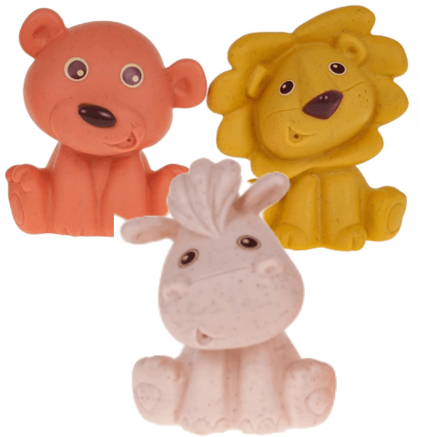 Cele 3 figurine – leu, urs și măgăruș – pot fi strânse, mușcate și mângâiate fără griji, fiind realizate din materiale sigure pentru dentiție.