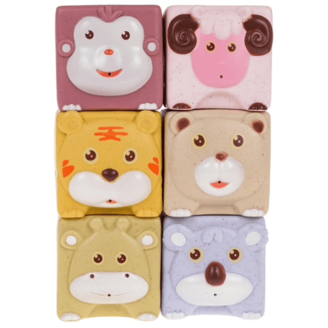 Cuburile moi cu animale sunt ușor de strâns în mână și prezintă fețe prietenoase ce stimulează recunoașterea animalelor și culorilor.