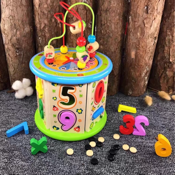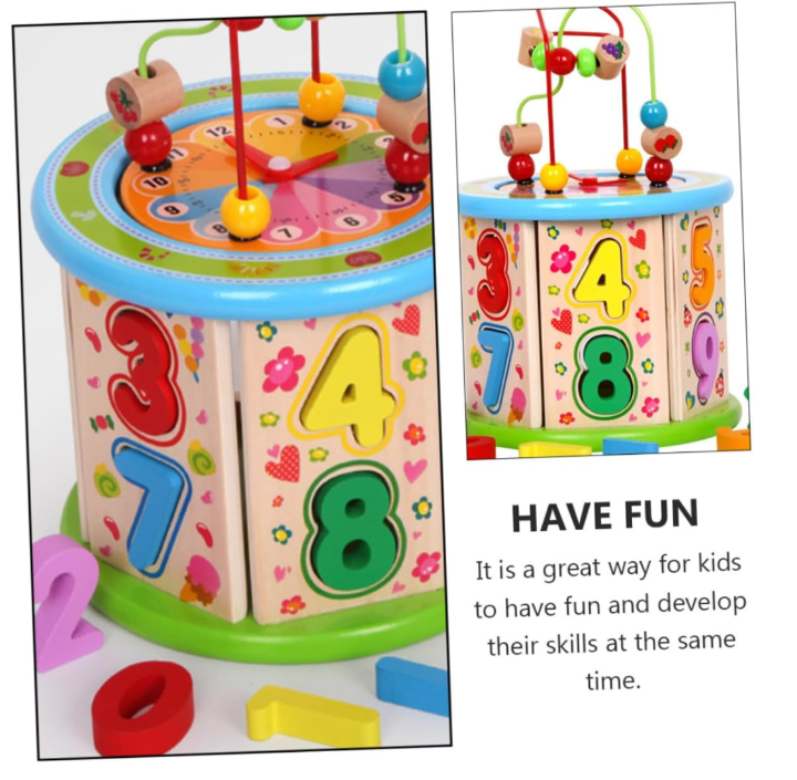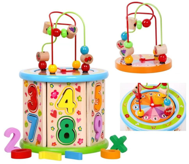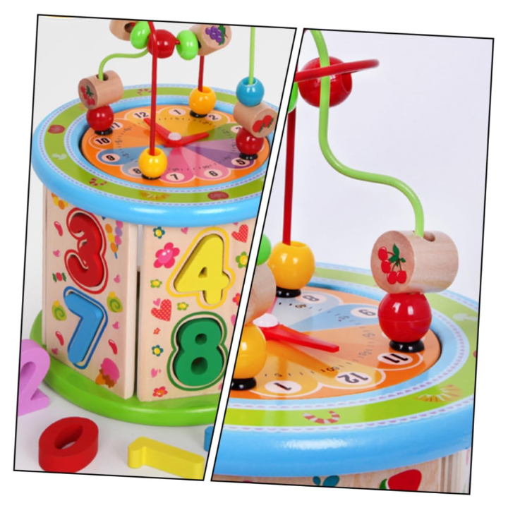 Părțile laterale includ spații pentru potrivirea formelor și numerelor, dezvoltând astfel abilitățile de recunoaștere a culorilor și cifrelor.