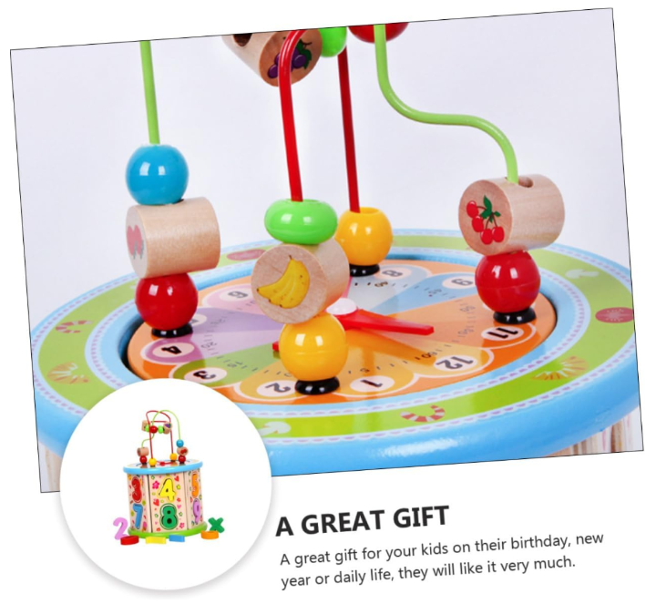 La partea superioară, spiralele metalice încurajează abilitățile motorii fine prin mișcarea mărgelelor din lemn, fiecare având un design prietenos cu fructe și imagini vesele.
