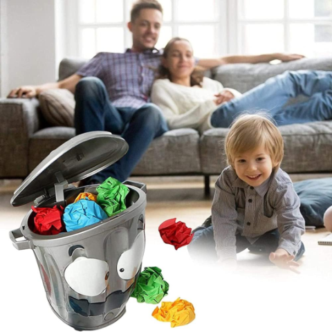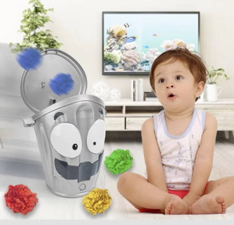 Coșul de gunoi interactiv „Bătaia cu hârtie” este o jucărie amuzantă care îi provoacă pe copii să arunce bile colorate din hârtie într-un coș simpatic, care se mișcă.