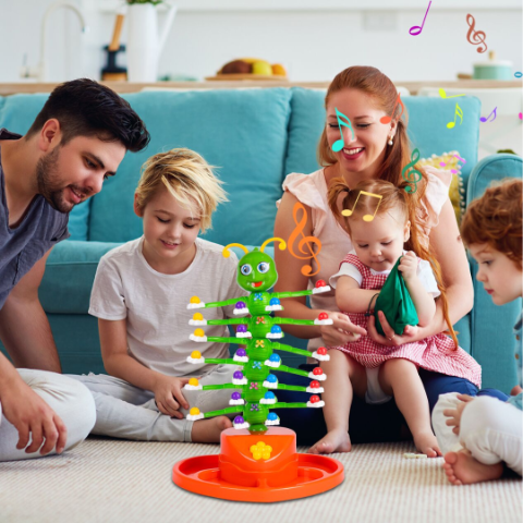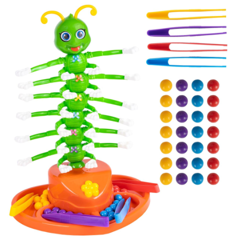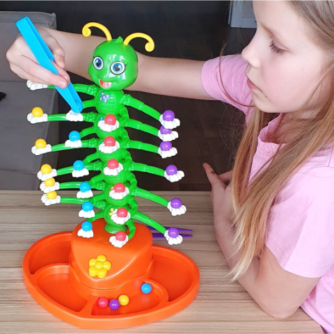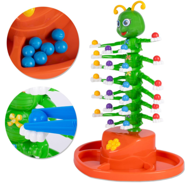 Omida veselă își mișcă brațele în toate direcțiile, iar copiii trebuie să își folosească îndemânarea pentru a așeza bilele colorate fără să le scape.