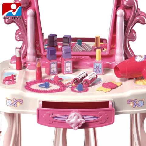 Această masă de toaletă aduce strălucirea unui palat regal în camera copilului, cu un design roz fermecător și detalii strălucitoare.