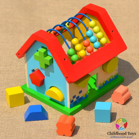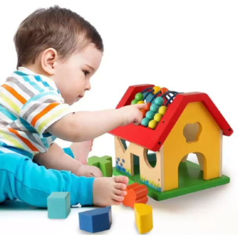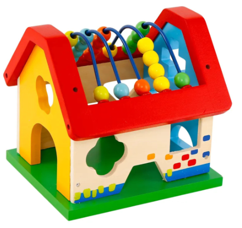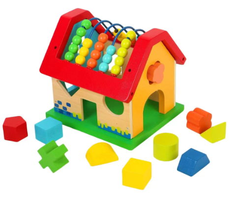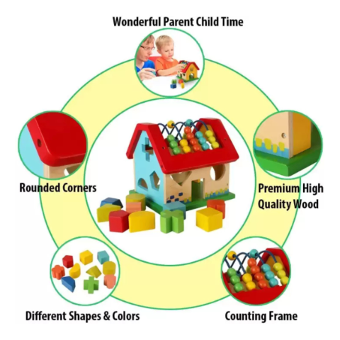 Această căsuță educativă Montessori oferă o experiență de învățare interactivă, combinând un abac colorat, forme geometrice de sortat și alte activități educative.