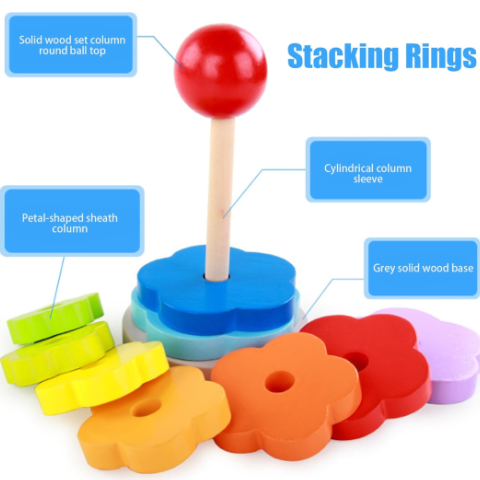 Inelul stivuitor este compus din piese mari, în formă de floare, care pot fi suprapuse, dezvoltând astfel coordonarea și abilitățile motorii.