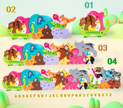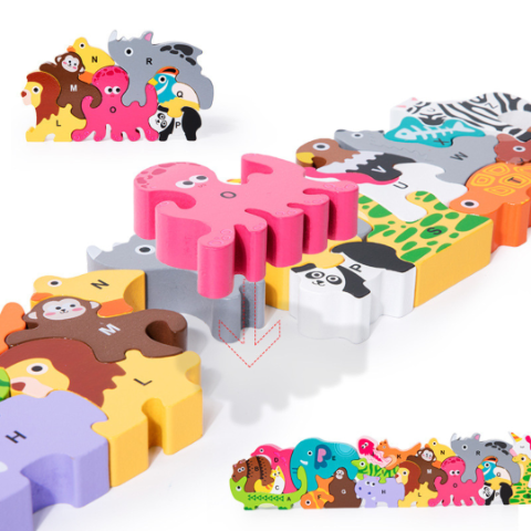 Un puzzle interactiv din lemn, perfect pentru copiii curioși care învață alfabetul și formele animalelor.