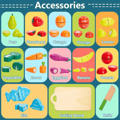 Acest set adorabil din lemn include 11 tipuri de fructe și legume viu colorate, un cuțit din lemn, tocător și o găleată practică pentru depozitare.