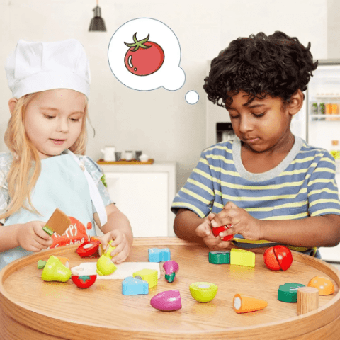 Legumele și fructele pot fi combinate, sortate și „gătite” în jocuri de rol pline de imaginație.