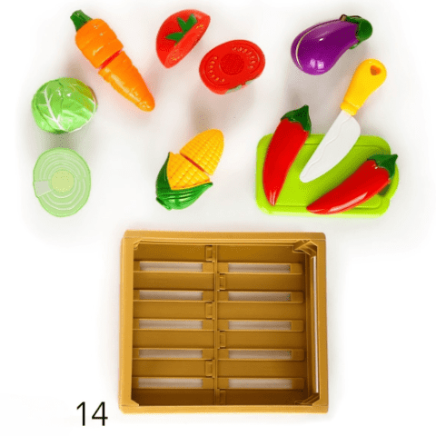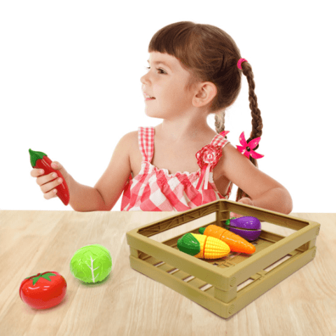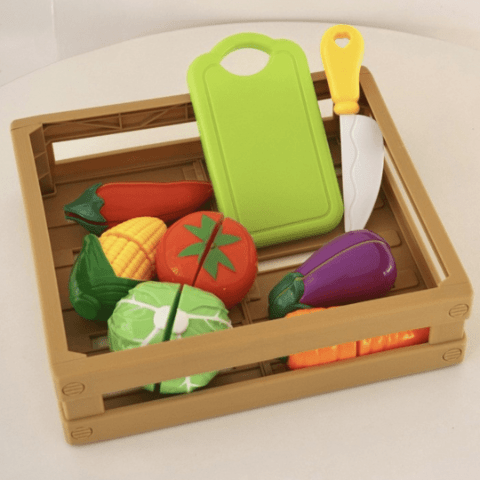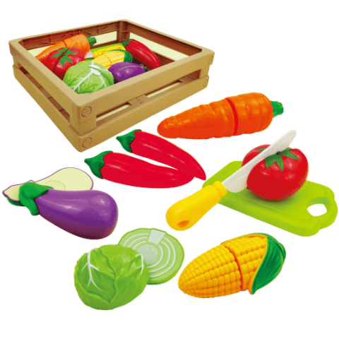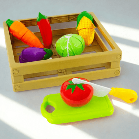 Setul conține legume viu colorate din plastic durabil, ideale pentru tăiat și joacă creativă în bucătăria de jucărie.