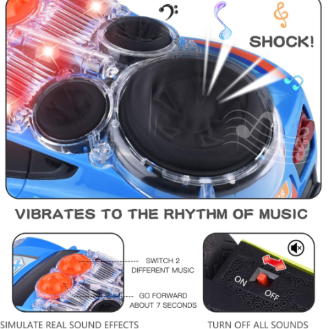 Cu funcția de deplasare automată, mașinuța se mișcă pe podea în ritmul muzicii, adăugând o notă vibrantă în joacă.