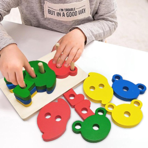 Copiii trebuie să potrivească formele pe suportul din lemn, construind astfel propriul ursuleț vesel.
