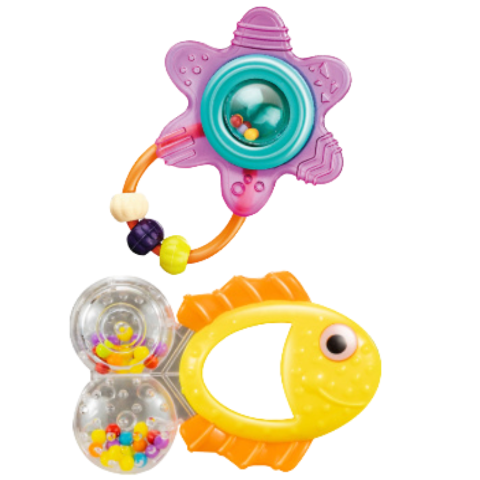 Forma de pește cu biluțe colorate stimulează simțul auditiv și vizual, în timp ce steaua cu biluțe rotative antrenează dexteritatea.