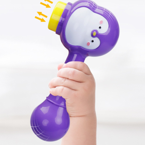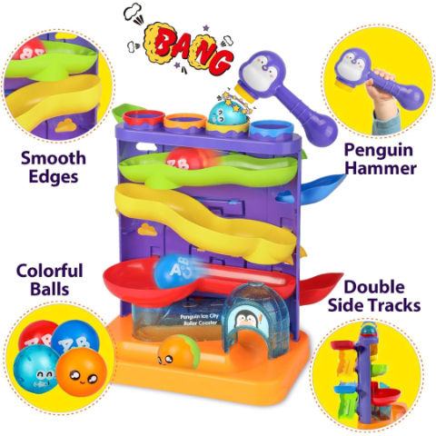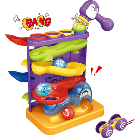 Micul ciocan în formă de pinguin adaugă un element interactiv, permițând copiilor să lovească bilele pentru a începe călătoria.