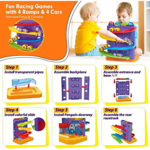 Mașinuța inclusă creează curse interesante pe rampe, menținând atenția și curiozitatea celor mici.