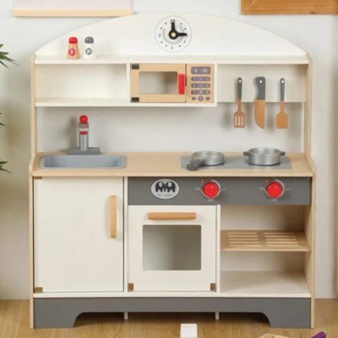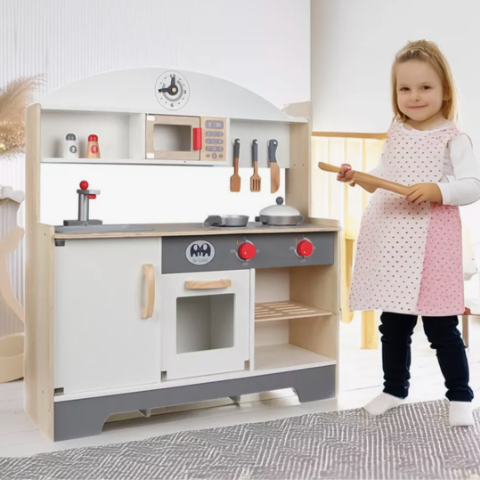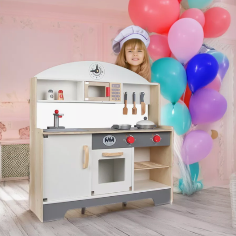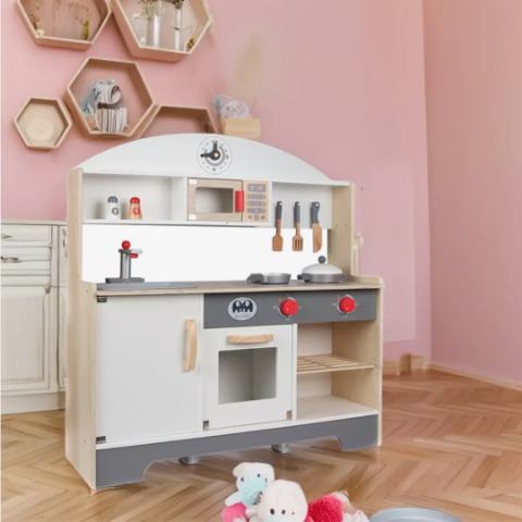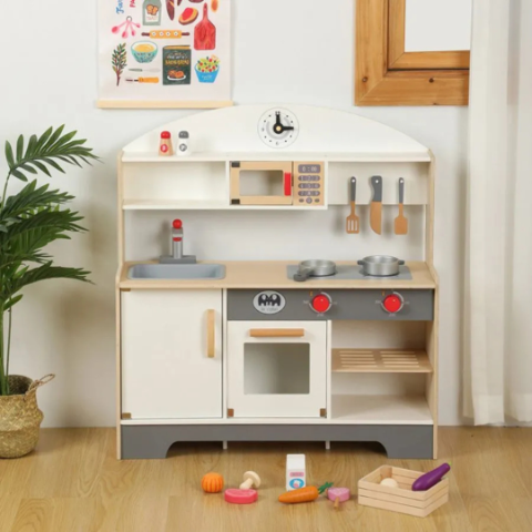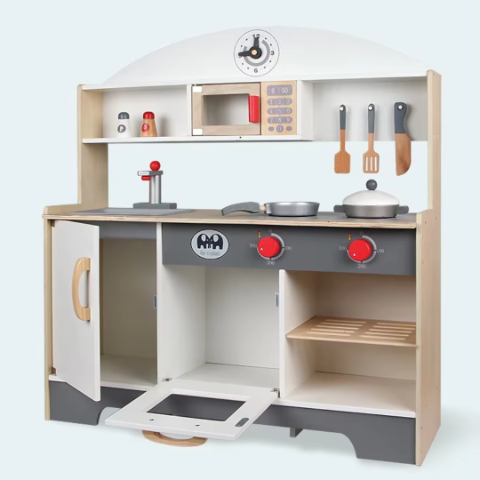 Această bucătărie din lemn este perfectă pentru micii bucătari care doresc să exploreze gătitul într-un mod sigur și distractiv.