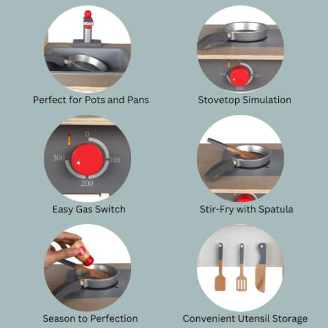 Include o plită cu butoane rotative care adaugă realism fiecărei sesiuni de gătit.