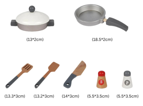 Accesoriile din lemn, cum ar fi tigăile, spatulele și condimentele, completează experiența culinară.
