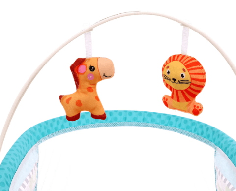 Arcul central susține două jucării viu colorate care atrag atenția și stimulează curiozitatea micuțului.