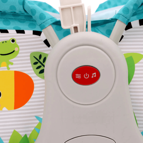 Salteluța moale cu imprimeuri de animale din junglă creează un ambient prietenos și plin de culoare.