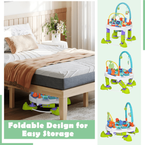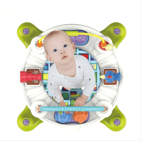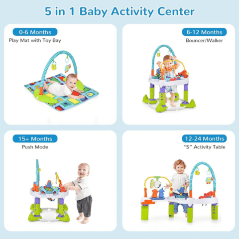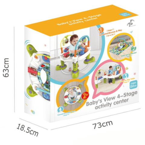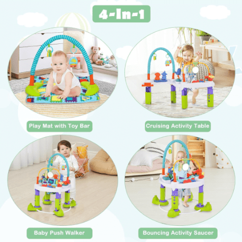 Acest centru 4-în-1 include salteluță, masă de joacă, bază de sărit și premergător, oferind o soluție completă de joacă în fiecare etapă.