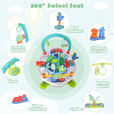 Centru de activități cu bază stabilă și scaun rotativ stimulează joaca interactivă și dezvoltarea simțurilor.