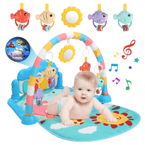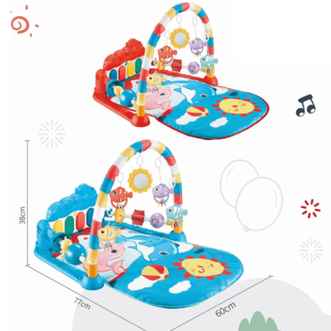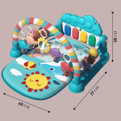 Salteluța colorată include jucării suspendate sub formă de peștișori și oglinjoare, stimulând simțurile și coordonarea bebelușului.